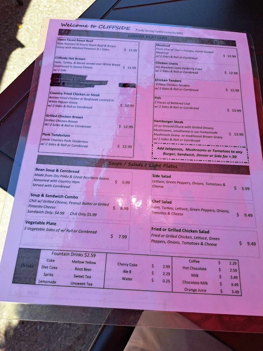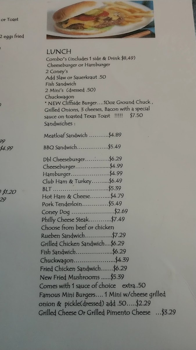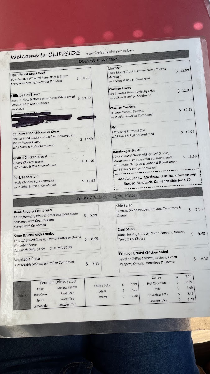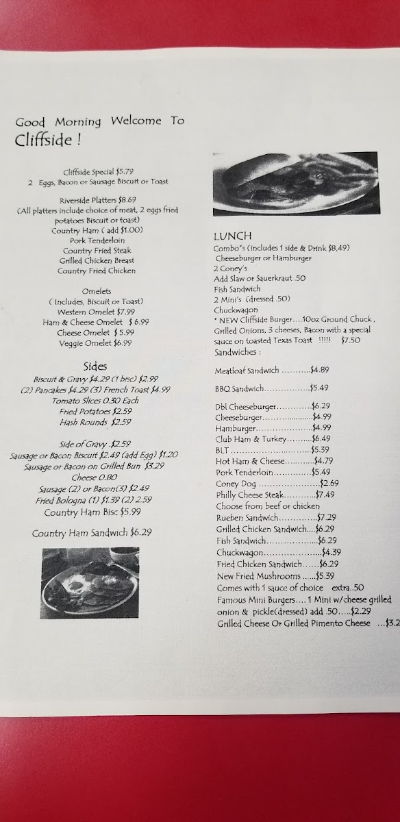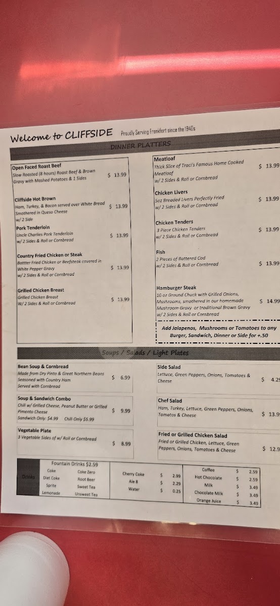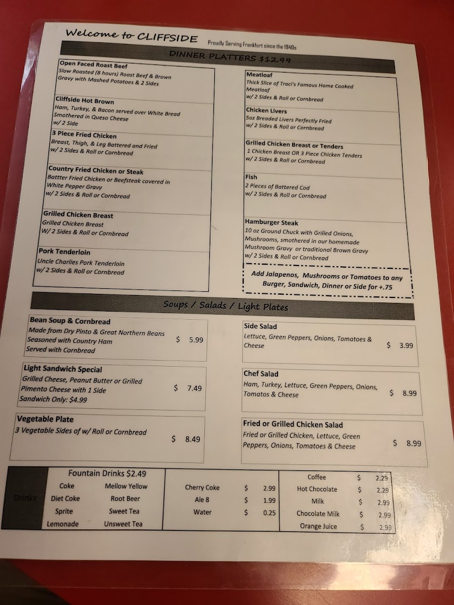Welcome to Cliffside Diner, where classic Americana meets delicious comfort food. Nestled along the scenic 175 Old Lawrenceburg Road in Frankfort, KY, this diner offers a menu that pays homage to hearty, traditional dishes. Start your day with a satisfying Western Omelet or a comforting plate of Country Fried Steak. For lunch, indulge in the nostalgic Fried Bologna Sandwich or savor the rich flavors of the Philly Cheesesteak.